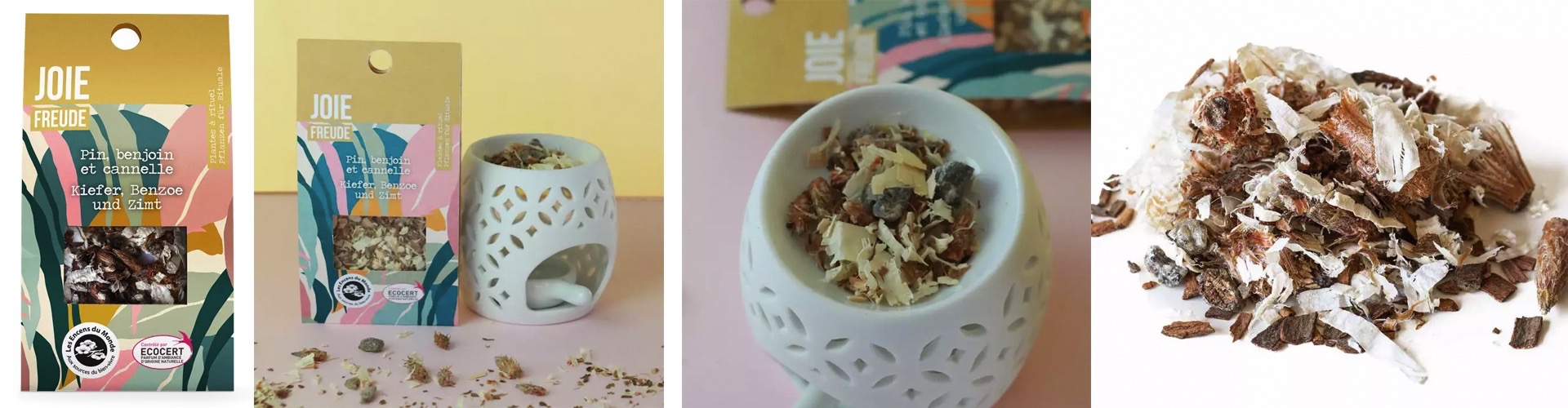 Ce sont des plantes à brûler constituées d’un mélange dynamisant de résine de benjoin, de bourgeons de pin sylvestre, de cannelle et de copeaux de résineux, idéal pour cultiver sa joie et réconforter.